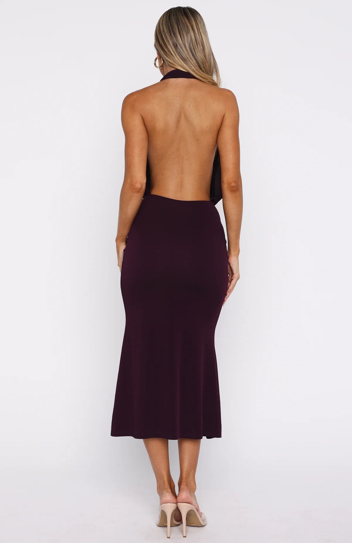 The kind of dress you’ll want to wear long after the party’s over. The Champagne Rush Midi Dress Plum features a halter neck design with an ultra low cowl, plunge neckline, backless design, attached flower detailing, lined material and stretch for an easy slip-on design. Add high shine accessories and perspex heels for a show-stopping look!