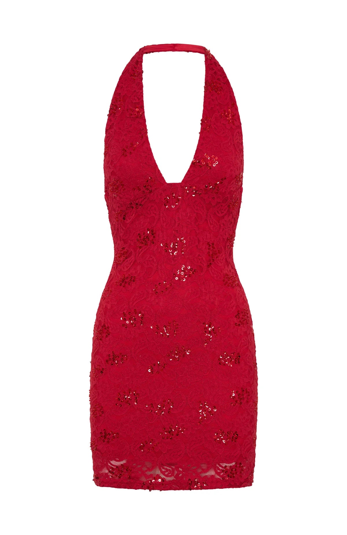 Turn heads at the Eiffel Tower in the Disco Damage Lace Mini Dress in Red. This sultry piece features fixed halter straps and a plunging neckline adorned with delicate lace trim. Its figure-hugging silhouette is crafted from intricate lace fabric, enhanced with shimmering beaded detailing and finished with full lining for comfort. Wear bold heels, grab that eye-catching bag and layer gold jewellery...you're ready.