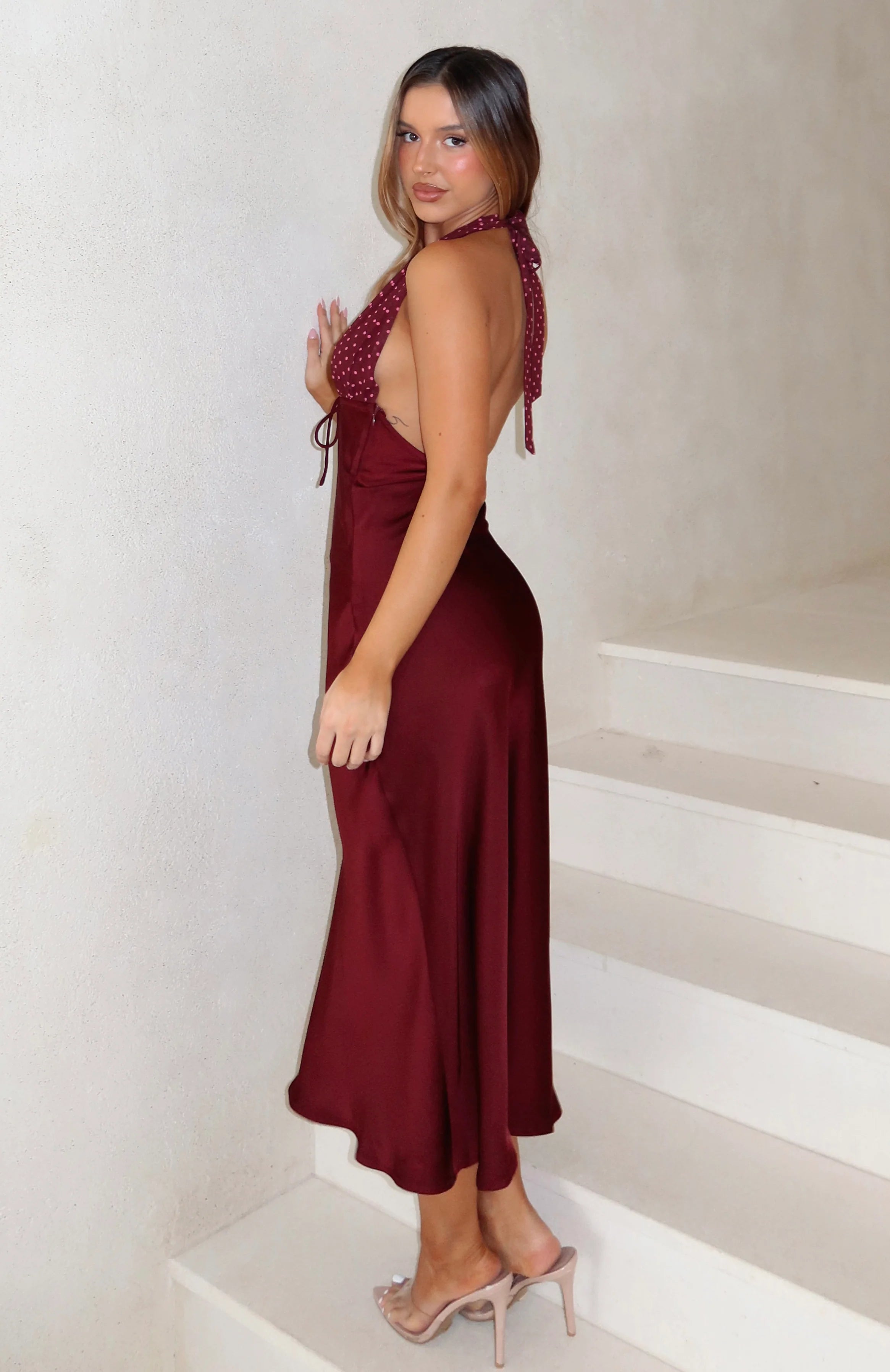 Make them take notice in the Guess You Miss Me Halter Midi Dress in Burgundy/Pink Dot — a stunning silhouette defined by thick self‑tie halter straps at the nape and a plunging neckline tied with a front bow. Its flowing maxi length and backless design bring drama and elegance, while the invisible side zipper with hook‑and‑eye closure ensures a flawless fit. Style it with kitten heels and minimal gold layers for a look that’s effortlessly captivating.