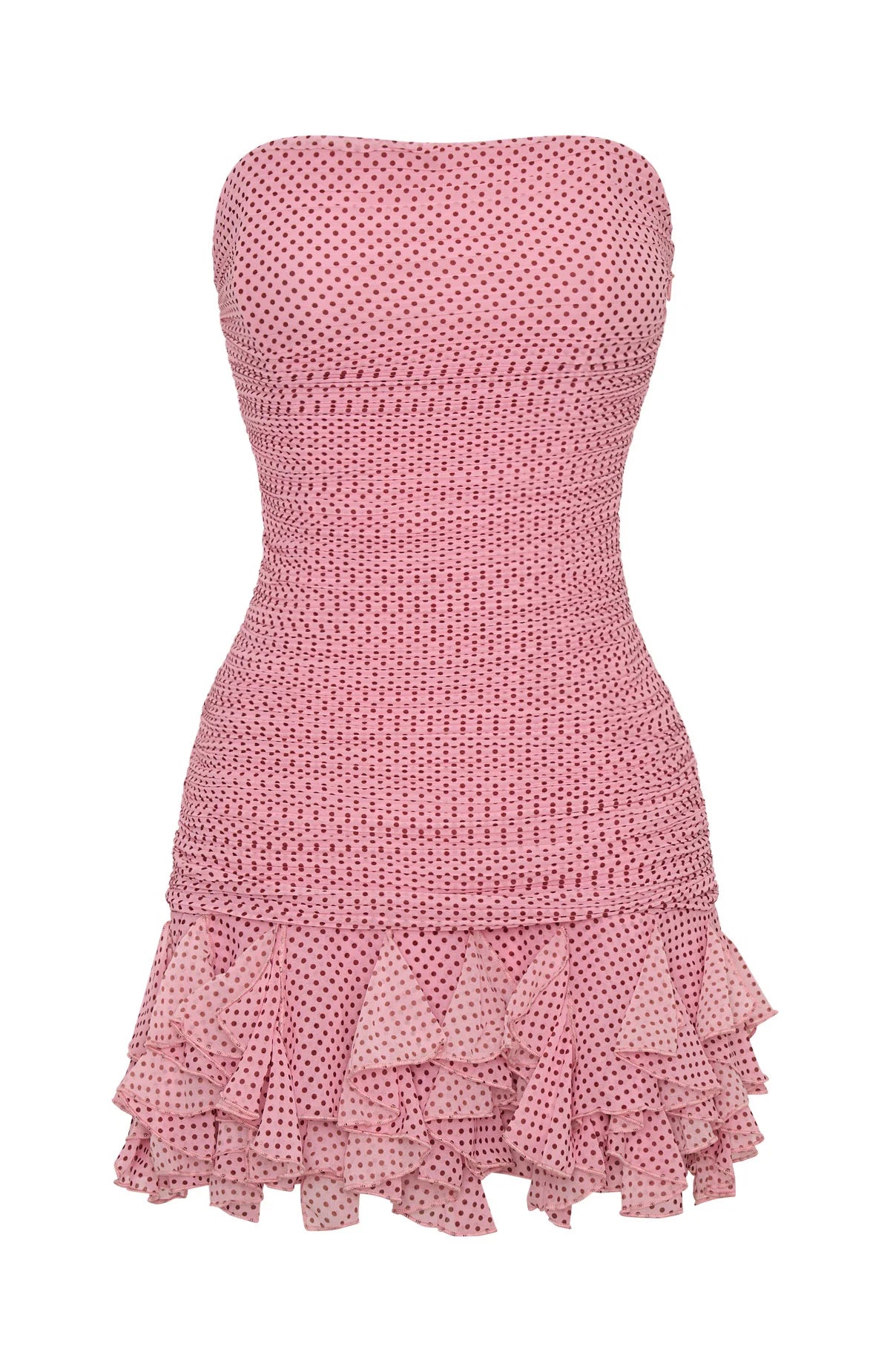 The High Gloss Strapless Mini Dress in Pink Polka Dot is your ultimate evening companion. It features a strapless neckline with grip tape, internal boning, subtle side ruching, and a fitted bodice. The drop waist silhouette is accentuated with a frill sash at the skirt hemline. An invisible side zipper with hook-and-eye closure ensures a seamless fit, while the full lining provides comfort. Feely girly by pairing with kitten heels and layered gold jewellery.