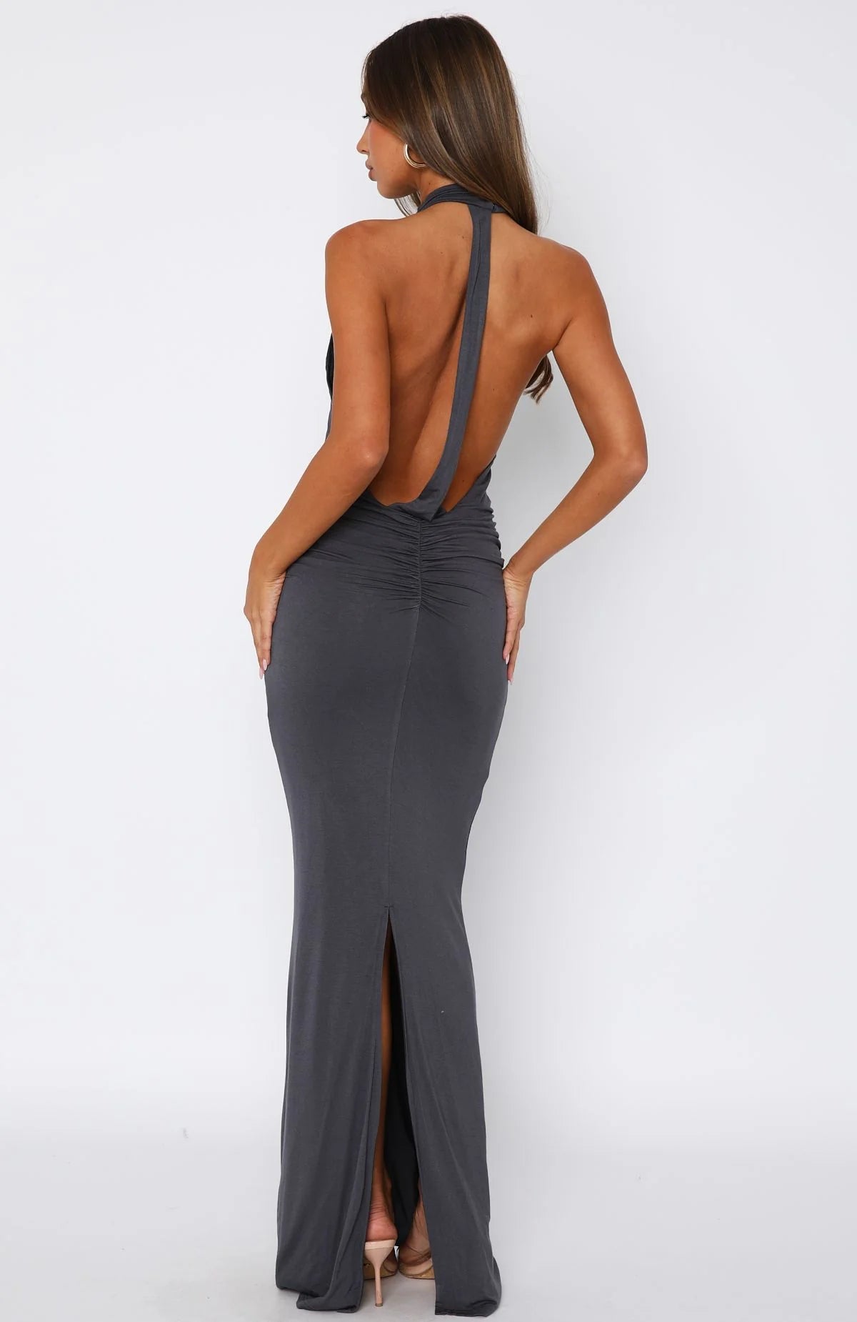 Our newest obsession: backless! The Made For You Maxi Dress in Steel features a halter neckline with hook and eye closure, backless design with strap from neck to lower back, ruched detailing on bottom, back leg split for ease of walkability and lined. Feel chic by pairing with heels and statement earrings!