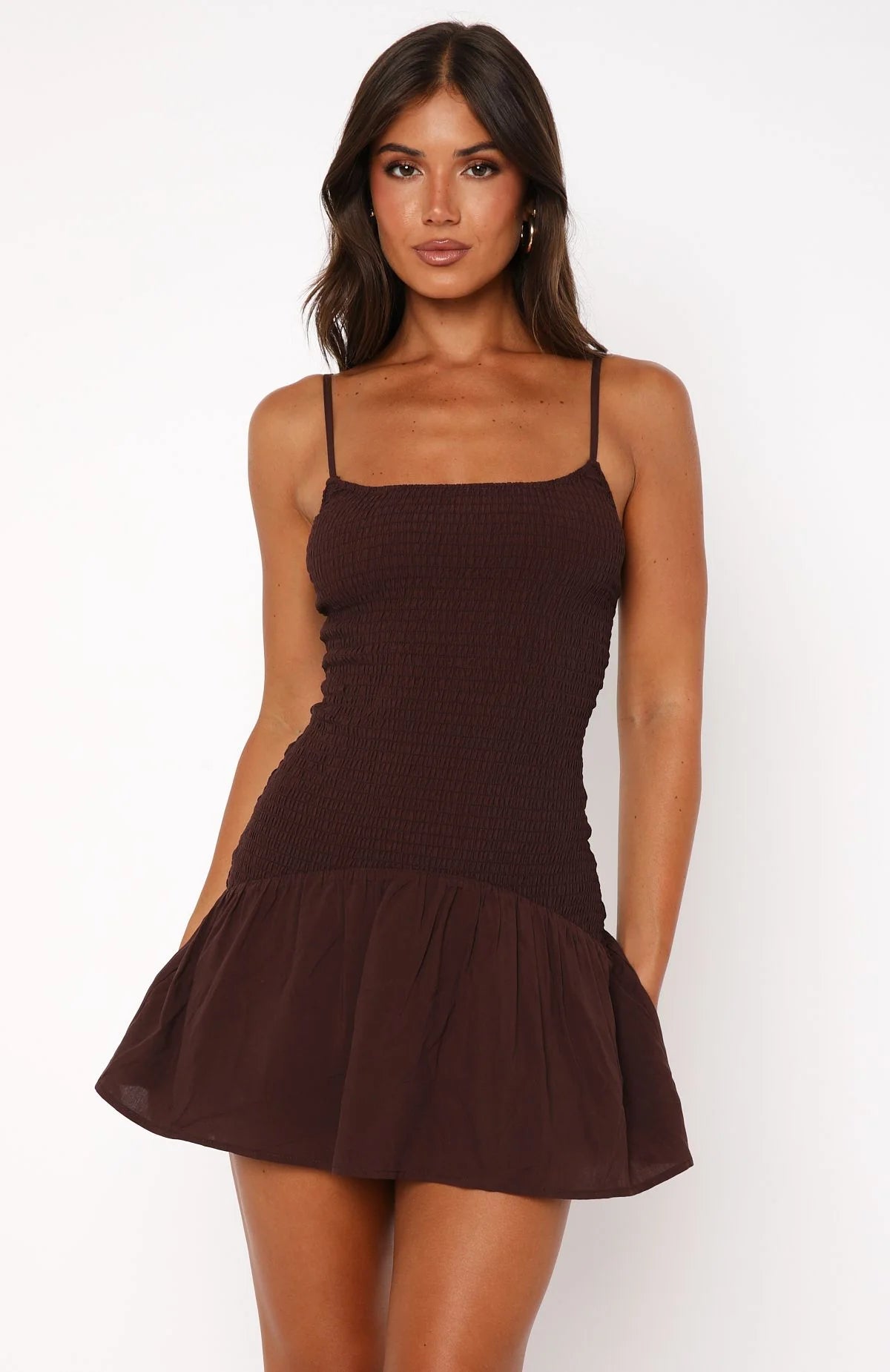 Put on this mini dress and get ready to stun! The Nothing Is Over Mini Dress Chocolate features thin, adjustable shoulder straps, square neckline, unlined, ruched bodice, lined skirt with frill detailing and stretch material for an easy slip on design.